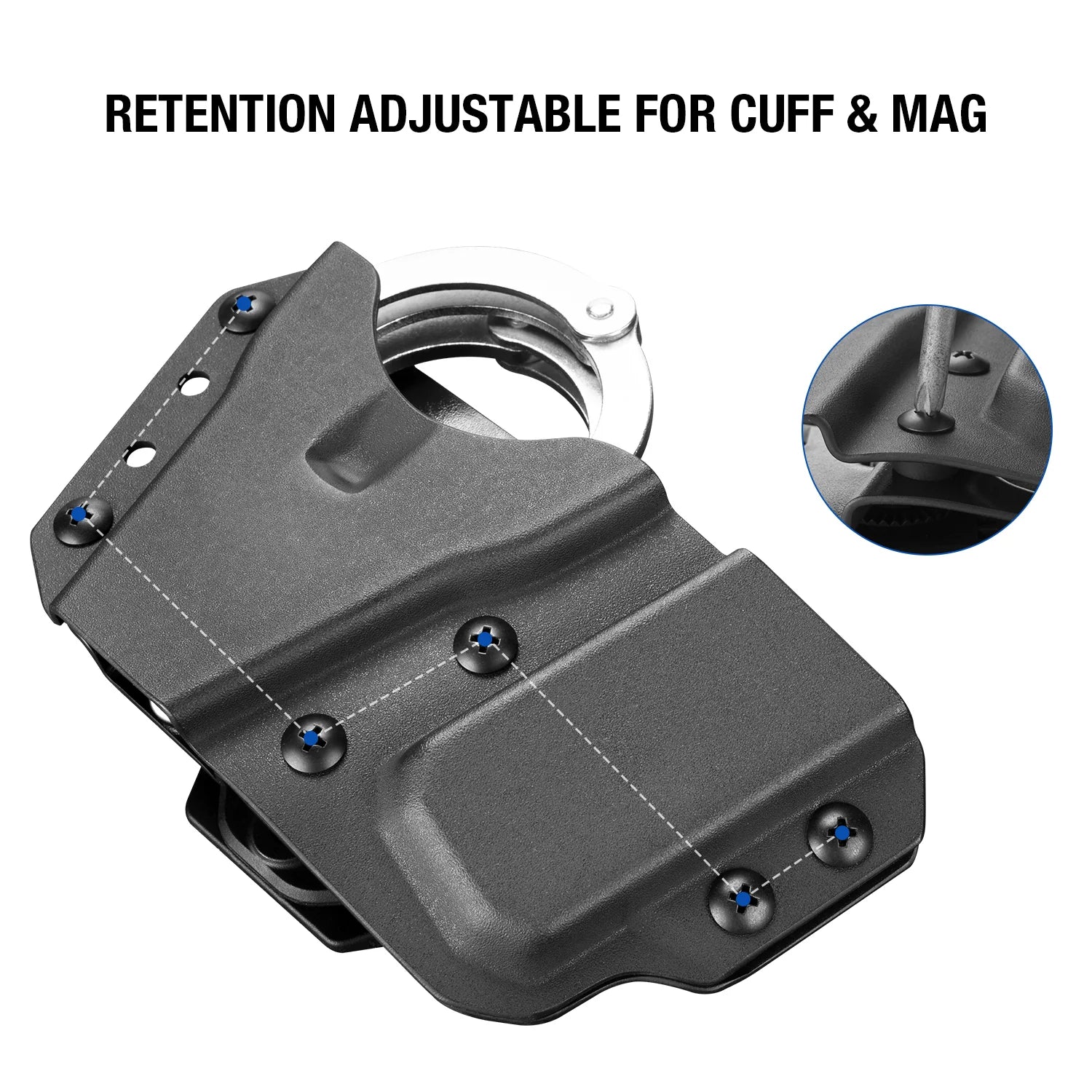 - RETENTION Adjustable - The retention for handcuff and mag is both adjustable so that you can set the tension to your personal preference.